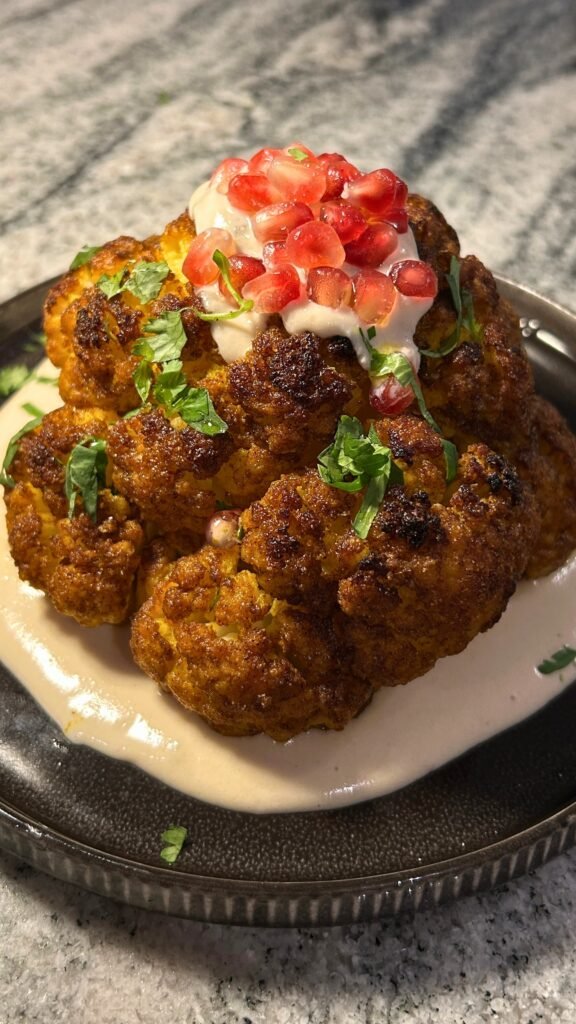 Low-effort, high-impact dish because every element pulls its weight. Roasted cauliflower for depth, whipped labneh for balance, pomegranate for pop. Simple techniques, bold flavours, and a very satisfying result.
